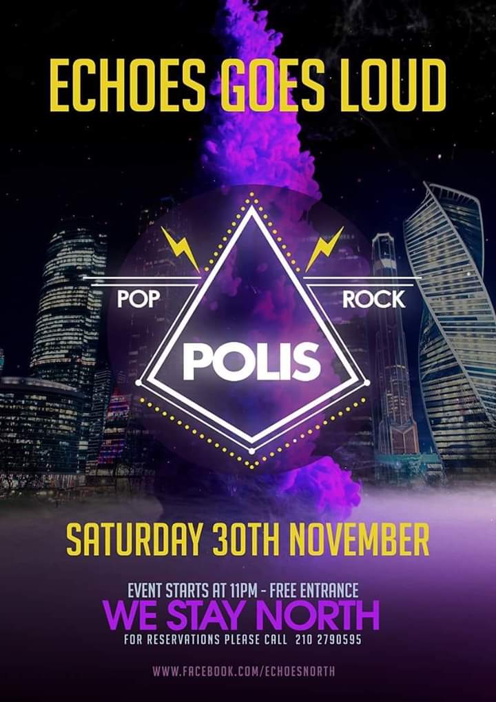 Αυτό το Σάββατο 30/11 Polis Live – Echoes. Σας περιμένουμε όλους 🎊💃 στο Νέο Ηράκλειο για να τα πιούμε🍹 με καλή μουσική🎤🙏 και πολύ χορό🕺🎷.